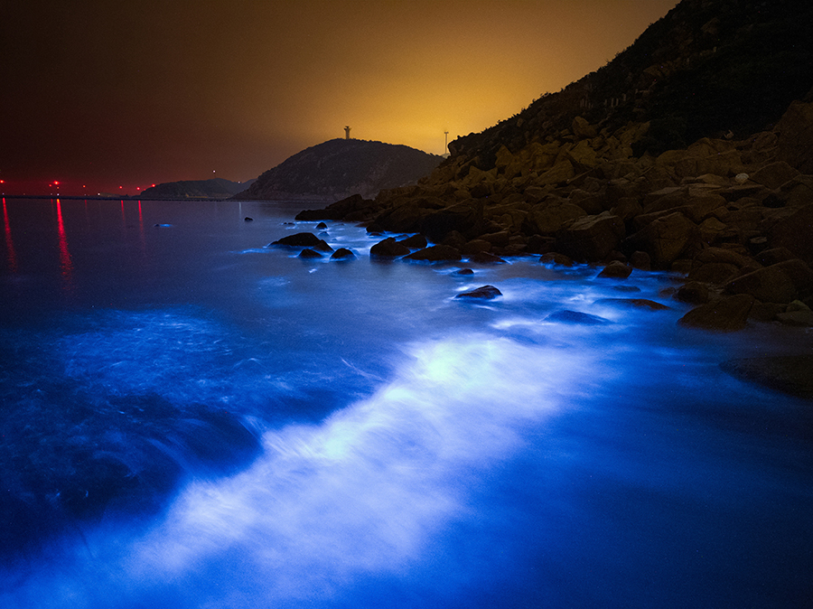 A photo shows the "blue tears" illuminate the waters off the coast of Pingtan island in southeast China's Fujian Province. (Photo by Chen Jinhai)