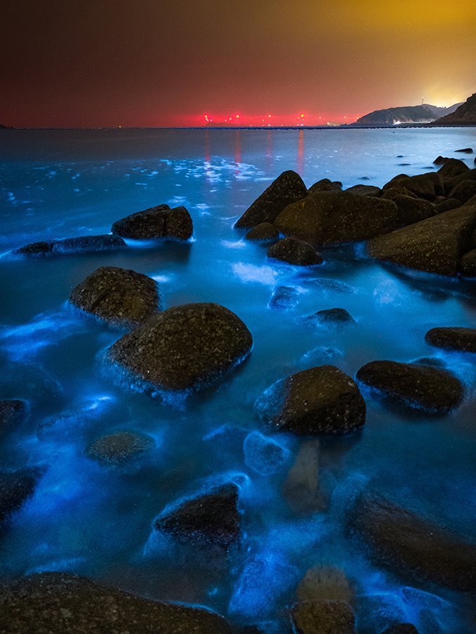 A photo shows the "blue tears" illuminate the waters off the coast of Pingtan island in southeast China's Fujian Province. (Photo by Chen Jinhai)