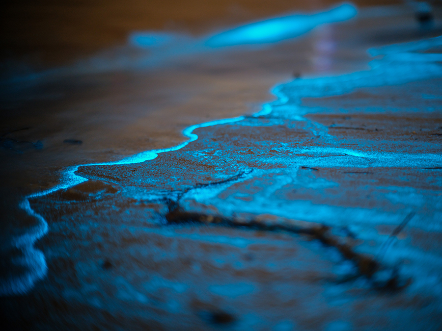 A photo shows the "blue tears" illuminate the waters off the coast of Pingtan island in southeast China's Fujian Province. (Photo by Ye Minmin)