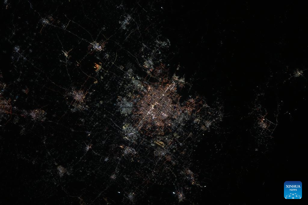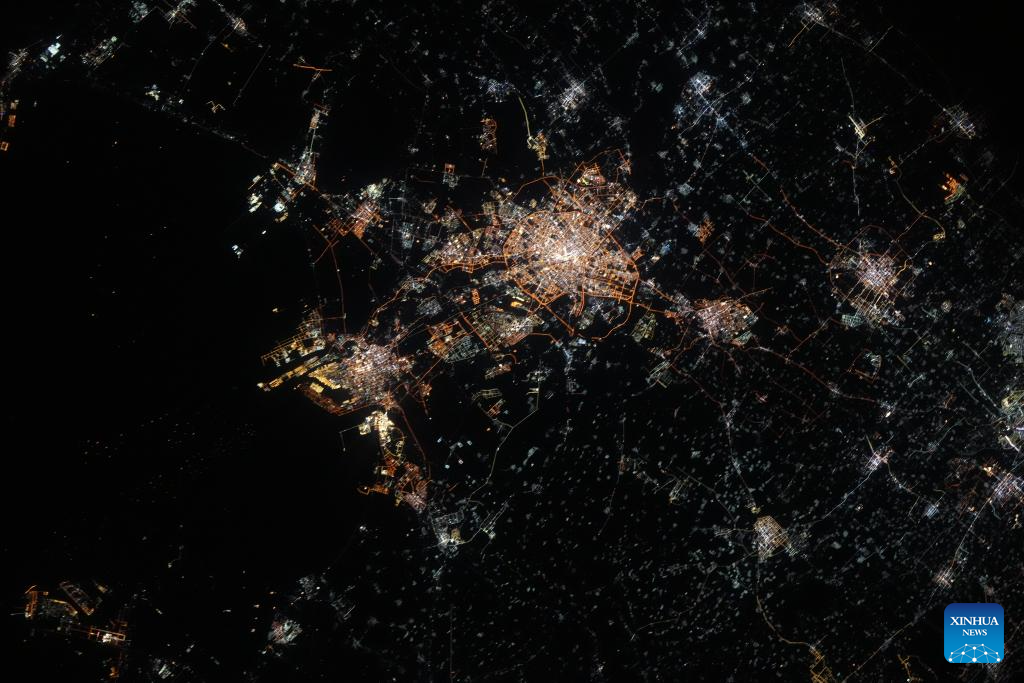 This undated photo taken from China's space station by Shenzhou-17 crew member Tang Hongbo shows the night view of Tianjin in north China. (Xinhua)