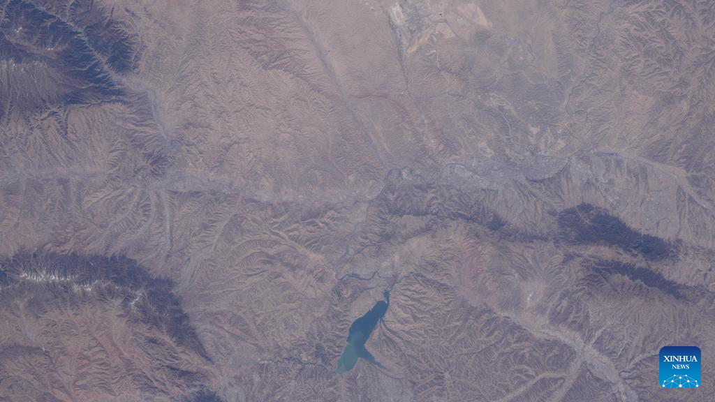 This undated photo taken from China's space station by Shenzhou-17 crew member Tang Hongbo shows a view of Liujiaxia reservoir in northwest China's Gansu Province. (Xinhua)