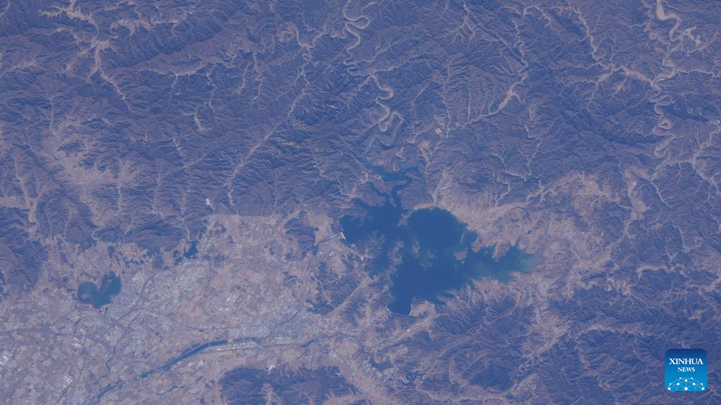 This undated photo taken from China's space station by Shenzhou-17 crew member Tang Hongbo shows a view of Miyun reservoir in Beijing of China. (Xinhua)
