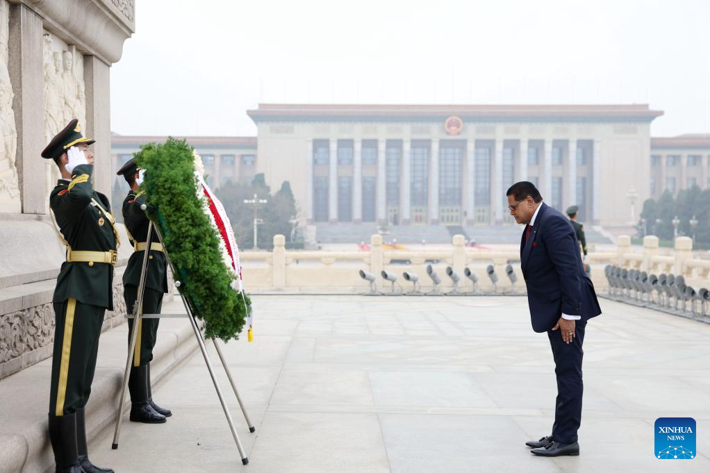 Surinamese president lays wreath at Monument to People's Heroes in Beijing