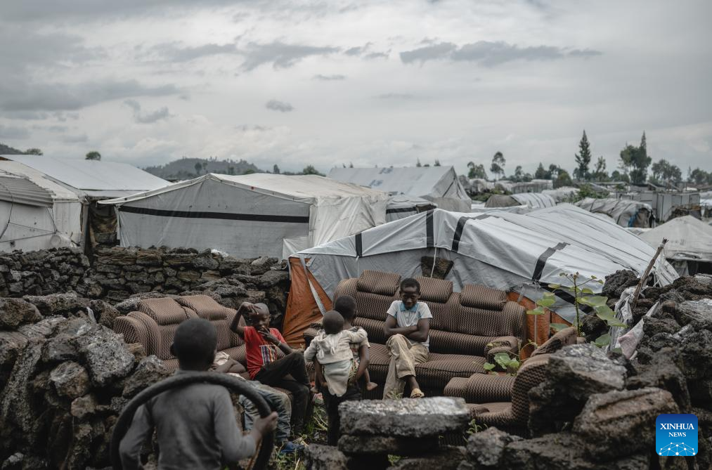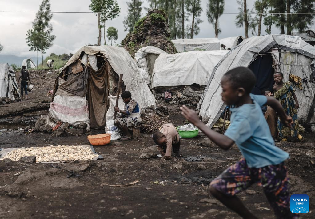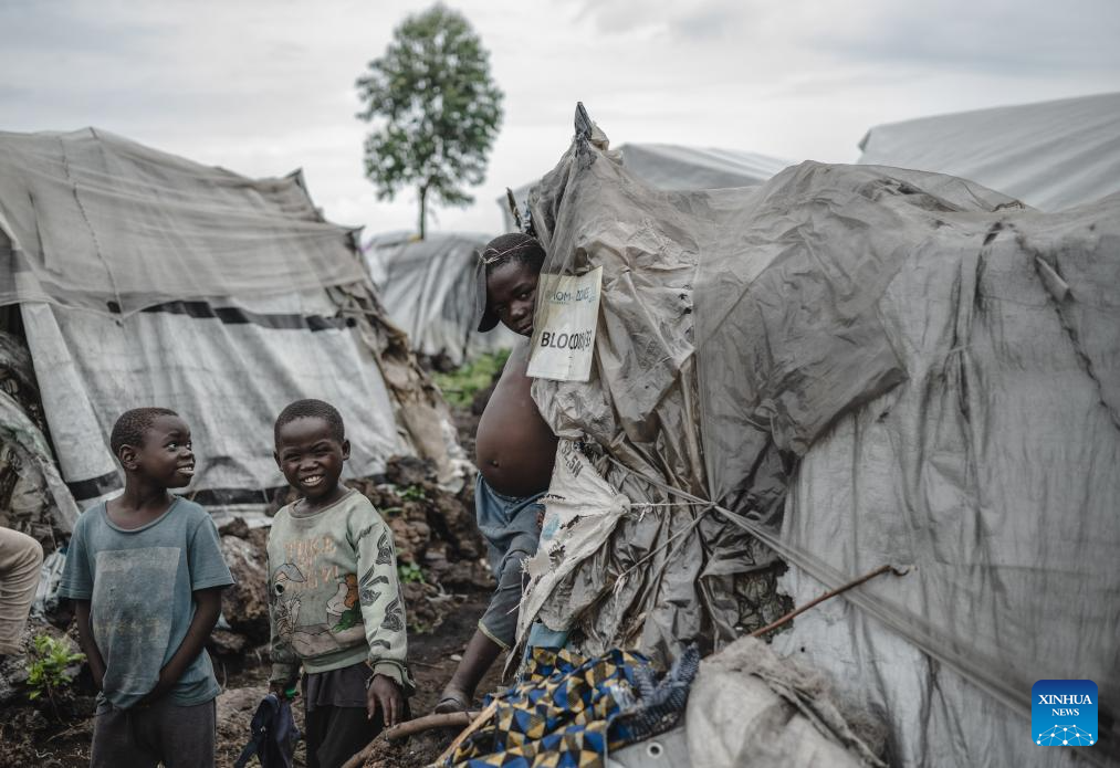 Children have fun in the internally displaced persons (IDP) camp, home to tens of thousands of war-displaced people, on the outskirts of Goma, eastern Democratic Republic of the Congo, April 11, 2024. (Xinhua/Wang Guansen)