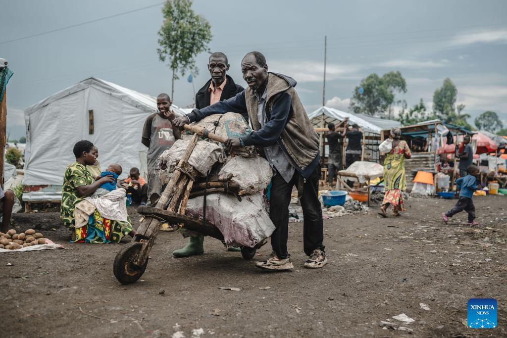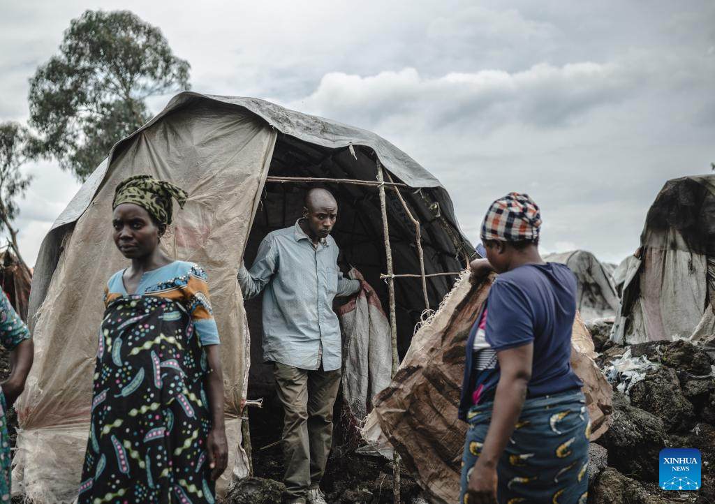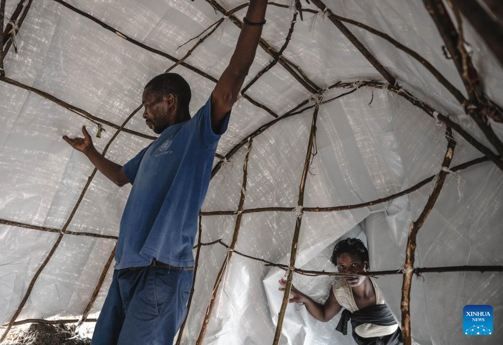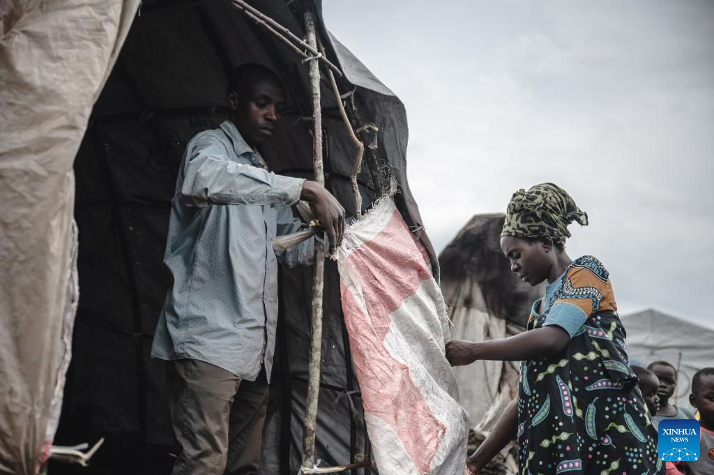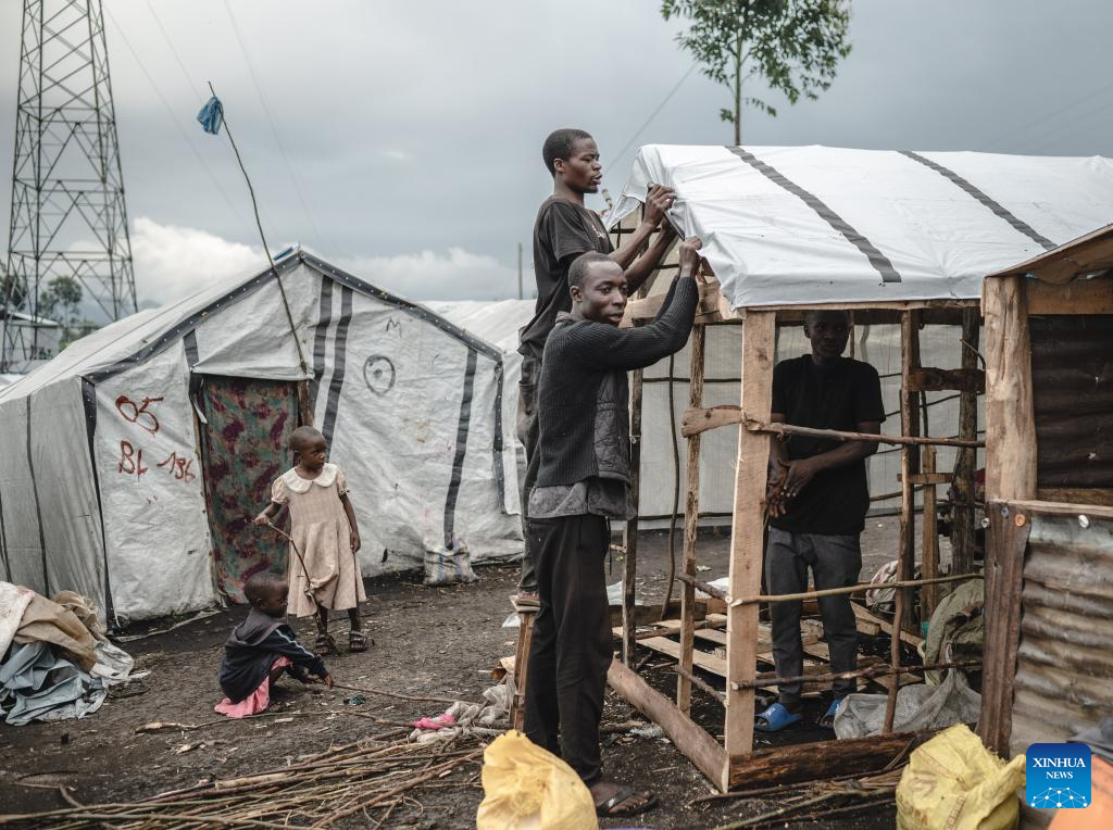 People build a tent in the internally displaced persons (IDP) camp, home to tens of thousands of war-displaced people, on the outskirts of Goma, eastern Democratic Republic of the Congo, April 11, 2024. (Xinhua/Wang Guansen)