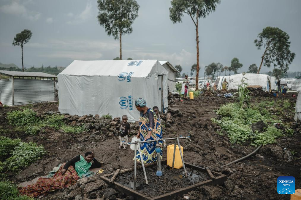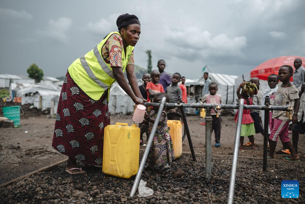 A woman collects water from a well in the internally displaced persons (IDP) camp, home to tens of thousands of war-displaced people, on the outskirts of Goma, eastern Democratic Republic of the Congo, April 11, 2024. (Xinhua/Wang Guansen)