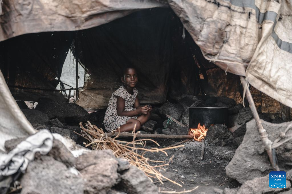 A displaced child cooks in a tent in the internally displaced persons (IDP) camp, home to tens of thousands of war-displaced people, on the outskirts of Goma, eastern Democratic Republic of the Congo, April 11, 2024. (Xinhua/Wang Guansen)