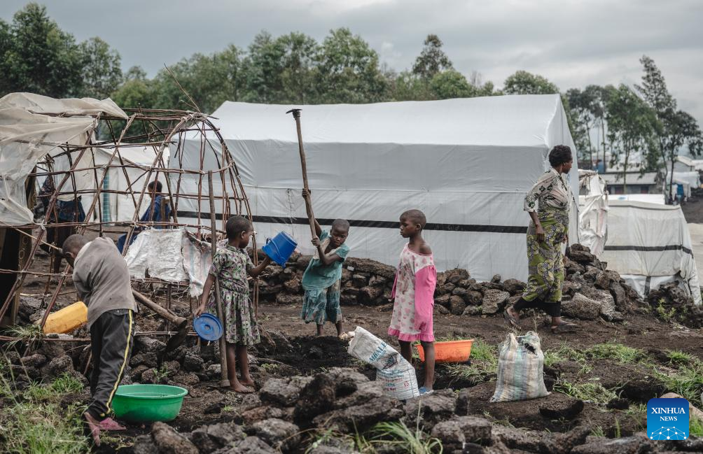 Children build a tent in the internally displaced persons (IDP) camp, home to tens of thousands of war-displaced people, on the outskirts of Goma, eastern Democratic Republic of the Congo, April 11, 2024. (Xinhua/Wang Guansen)