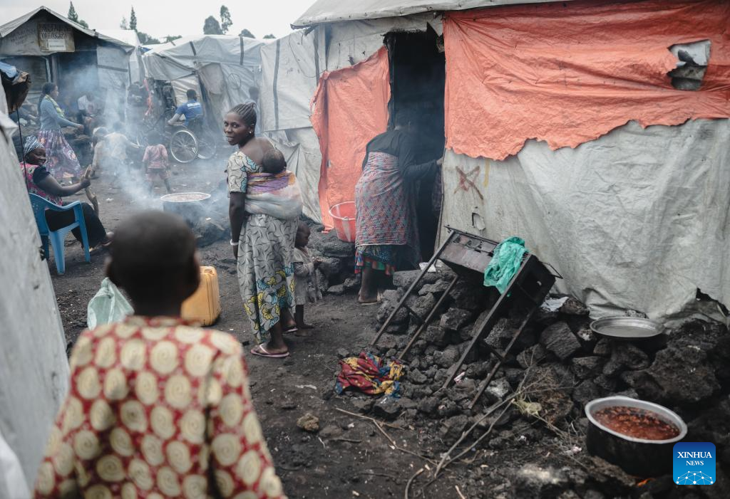 People prepare meal in the internally displaced persons (IDP) camp, home to tens of thousands of war-displaced people, on the outskirts of Goma, eastern Democratic Republic of the Congo, April 11, 2024. (Xinhua/Wang Guansen)