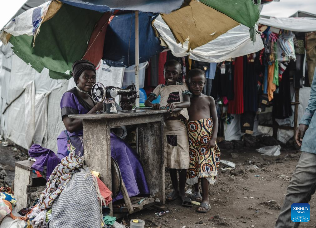 A tailor sews clothes in the internally displaced persons (IDP) camp, home to tens of thousands of war-displaced people, on the outskirts of Goma, eastern Democratic Republic of the Congo, April 11, 2024. (Xinhua/Wang Guansen)