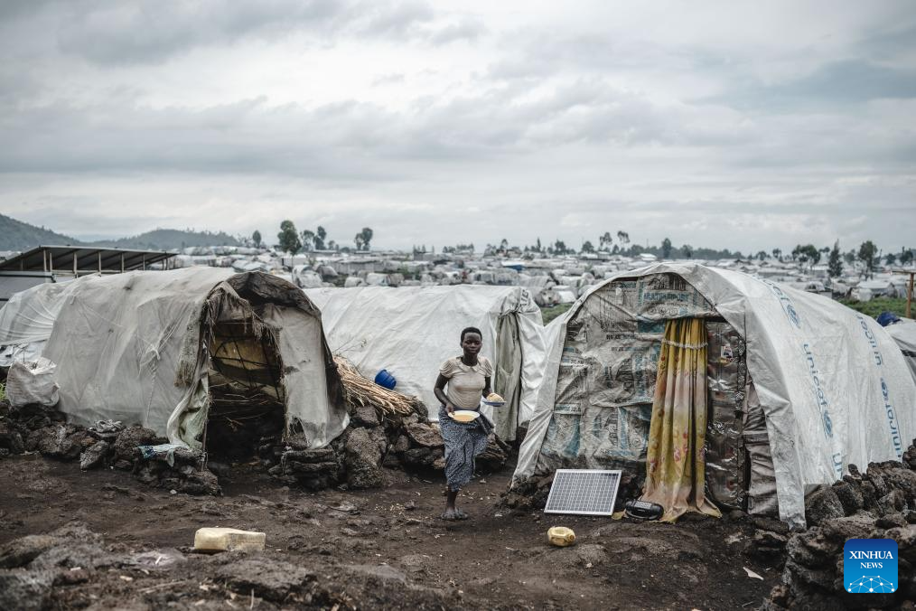 A displaced woman(C) mashes cassava in front of a tent in the internally displaced persons (IDP) camp, home to tens of thousands of war-displaced people, on the outskirts of Goma, eastern Democratic Republic of the Congo, April 11, 2024. (Xinhua/Wang Guansen)