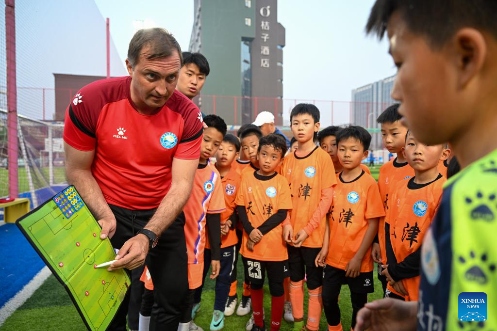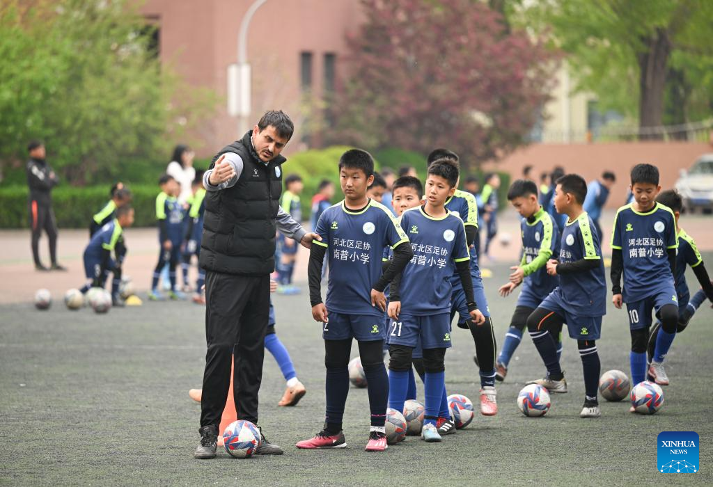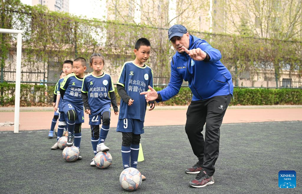 Young football players attend a training session under the instructions by Serbian coach Alen Cakara at Tianjin Foreign Languages School Nanpu Primary School in Tianjin Municipality, north China, April 10, 2024. Tianjin Football Association invited foreign football coaches to improve the skills and physical conditioning of local young Chinese footballers. (Xinhua/Sun Fanyue)