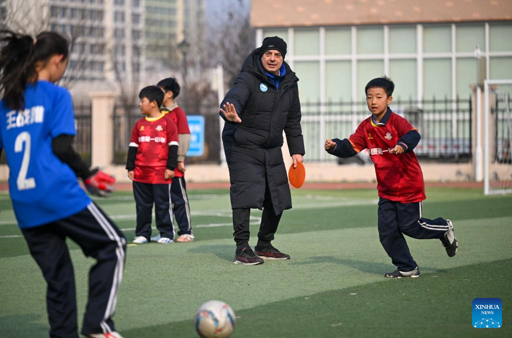 Spanish coach Pedro Jose Noguera Lopez (2nd R) gives instructions to young football players at Tianjin Jinghai Huakang NO.1 Primary School in Tianjin Municipality, north China, March 6, 2024. Tianjin Football Association invited foreign football coaches to improve the skills and physical conditioning of local young Chinese footballers. (Xinhua/Sun Fanyue)