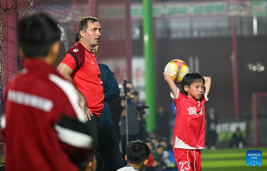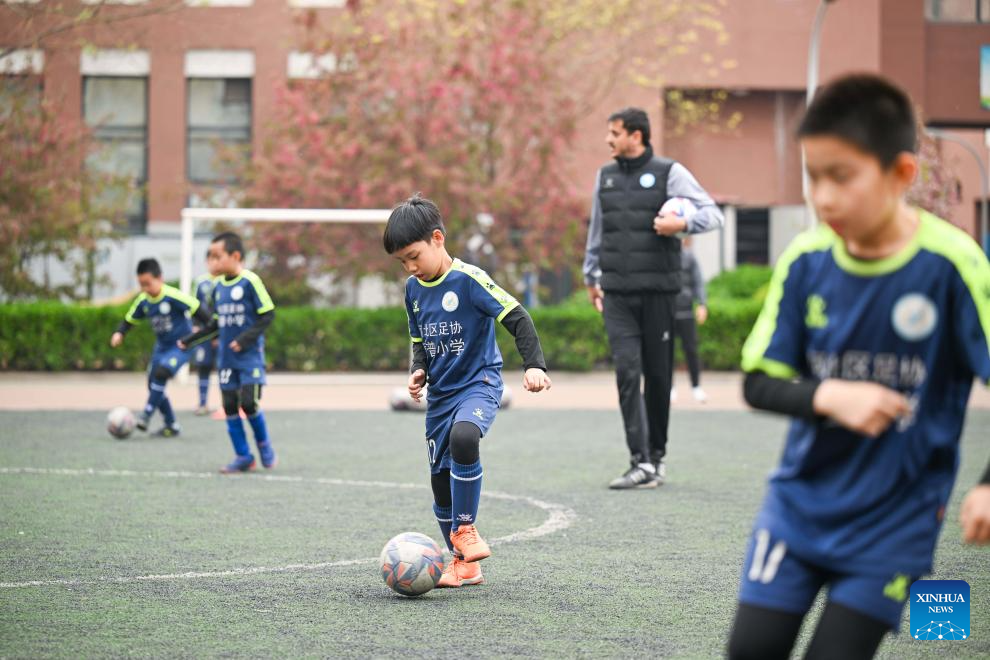 Young football players attend a training session under the instructions by foreign coach at Tianjin Foreign Languages School Nanpu Primary School in Tianjin Municipality, north China, April 10, 2024. Tianjin Football Association invited foreign football coaches to improve the skills and physical conditioning of local young Chinese footballers. (Xinhua/Sun Fanyue)