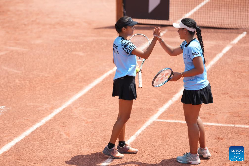 Guo Hanyu/Zhu Lin (Front) of China compete during the women's doubles match against Mehetia Boosie/Eleanor Schuster of Pacific Oceania at the Billie Jean King Cup 2024 tennis tournament Asia-Oceania Group I match in Changsha, central China's Hunan Province, April 12, 2024. (Xinhua/Xue Yuge)
