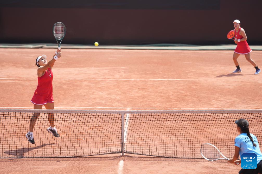 Guo Hanyu (L)/Zhu Lin of China compete during the women's doubles match against Mehetia Boosie/ Eleanor Schuster of Pacific Oceania at the Billie Jean King Cup 2024 tennis tournament Asia-Oceania Group I match in Changsha, central China's Hunan Province, April 12, 2024. (Xinhua/Xue Yuge)