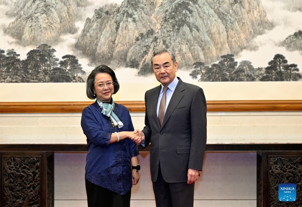 Chinese Foreign Minister Wang Yi, also a member of the Political Bureau of the Communist Party of China Central Committee, meets with Armida Salsiah Alisjahbana, executive secretary of United Nations Economic and Social Commission for Asia and the Pacific (ESCAP), in Beijing, capital of China, April 12, 2024. (Xinhua/Yin Bogu)