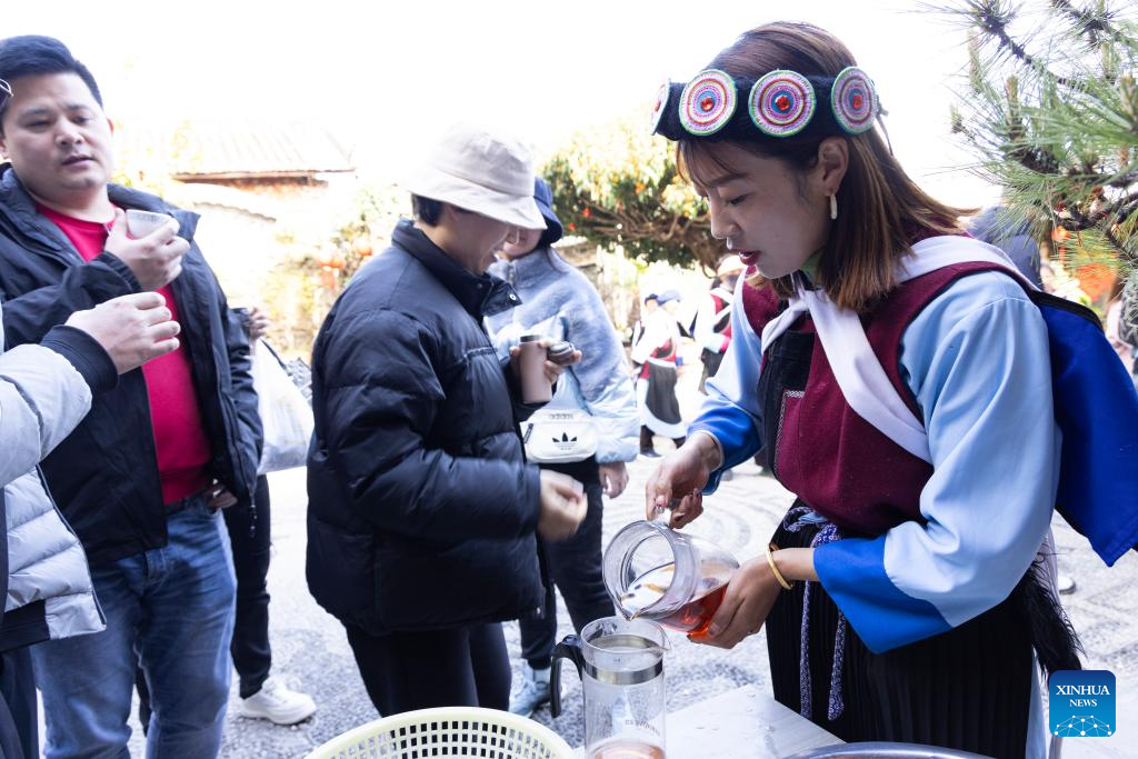 He Jielin (R) shows the traditional skills of making tofu to a tourist at home in Yuhu village, Lijiang City, southwest China's Yunnan Province, March 25, 2024. Living in Yuhu village at the foot of the Yulong Snow Mountain, He Jielin has witnessed the changes in this ancient Naxi village.