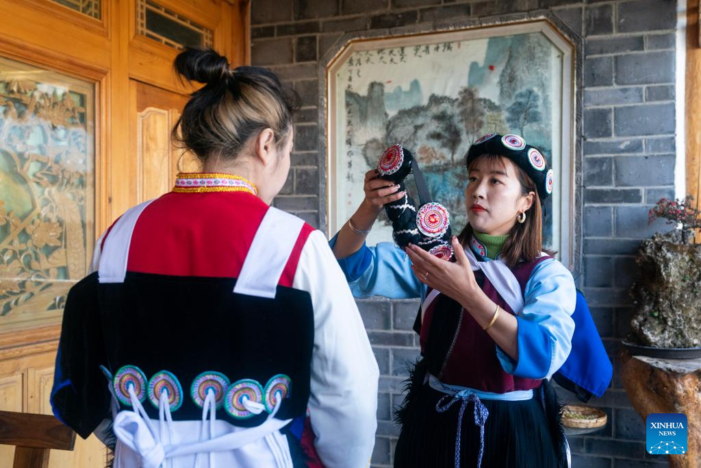 He Yuyue (R) helps a tourist put on traditional costume of Naxi ethnic group at home in Yuhu village, Lijiang City, southwest China's Yunnan Province, March 27, 2024. Living in Yuhu village at the foot of the Yulong Snow Mountain, He Jielin has witnessed the changes in this ancient Naxi village.