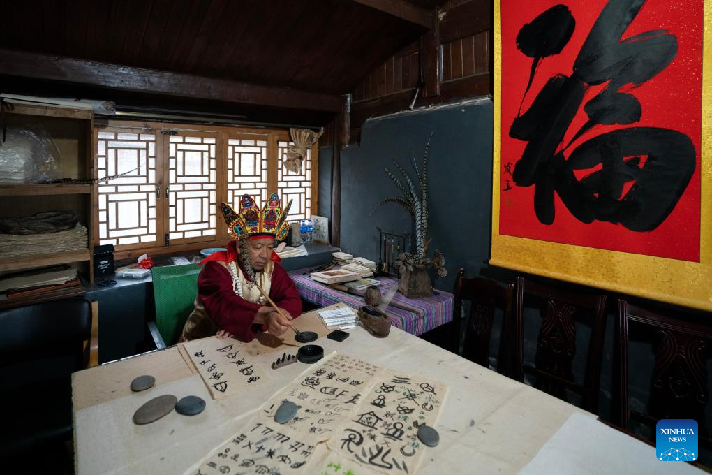 He Jielin writes in Dongba pictograph at home in Yuhu village, Lijiang City, southwest China's Yunnan Province, March 25, 2024. Living in Yuhu village at the foot of the Yulong Snow Mountain, He Jielin has witnessed the changes in this ancient Naxi village.
