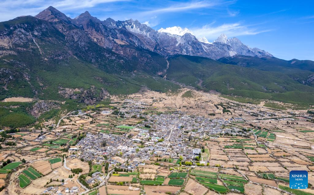 An aerial drone photo taken on March 25, 2024 shows the Yulong Snow Mountain and Yuhu village in Lijiang City, southwest China's Yunnan Province. Living in Yuhu village at the foot of the Yulong Snow Mountain, He Jielin has witnessed the changes in this ancient Naxi village.