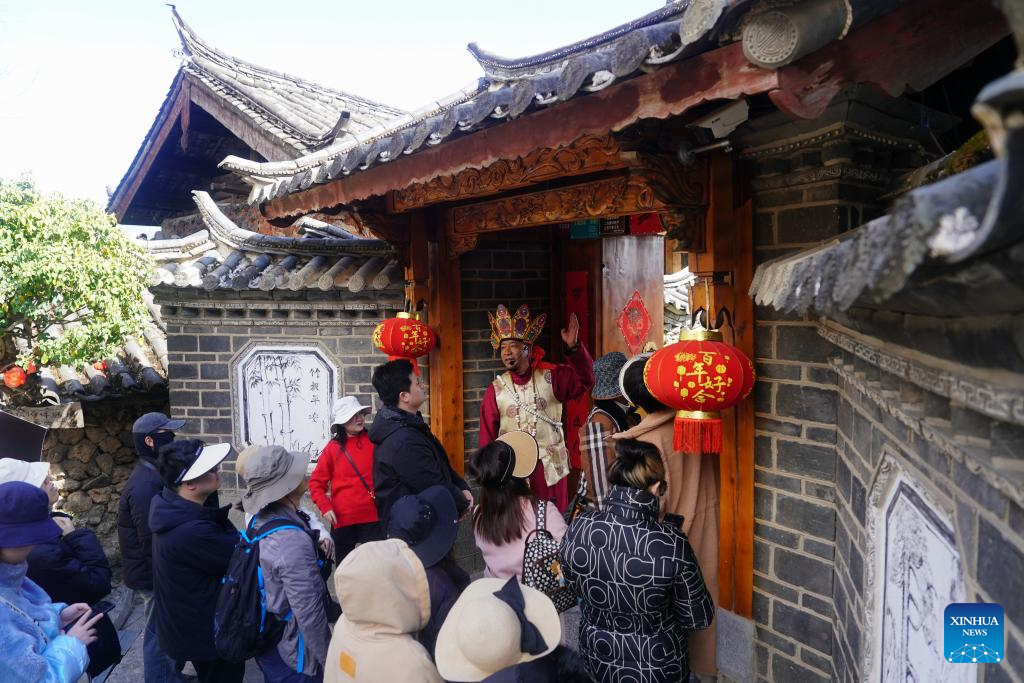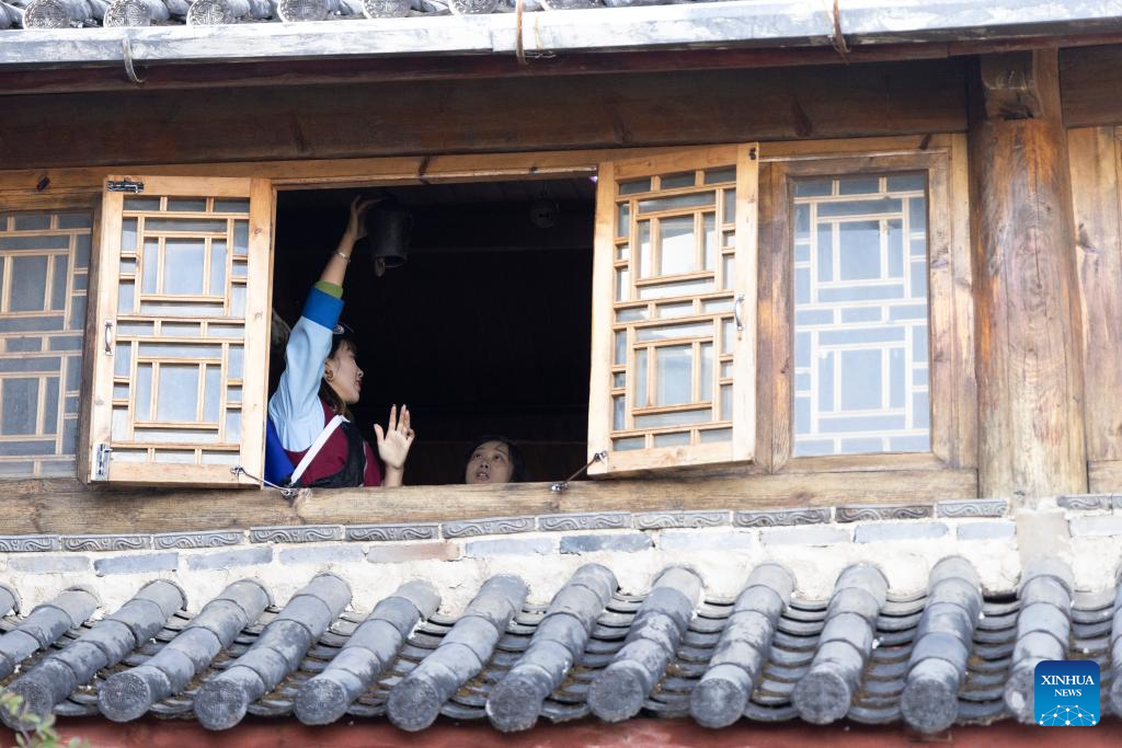 He Jielin guides tourists to his home in Yuhu village, Lijiang City, southwest China's Yunnan Province, March 27, 2024. Living in Yuhu village at the foot of the Yulong Snow Mountain, He Jielin has witnessed the changes in this ancient Naxi village.