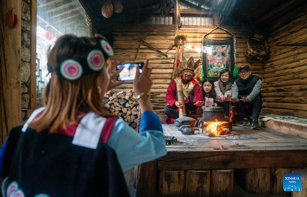 He Jielin (2nd L), and his daughter He Yuyue (1st L) introduce Naxi ethnic culture to tourists at home in Yuhu village, Lijiang City, southwest China's Yunnan Province, March 27, 2024. Living in Yuhu village at the foot of the Yulong Snow Mountain, He Jielin has witnessed the changes in this ancient Naxi village.
