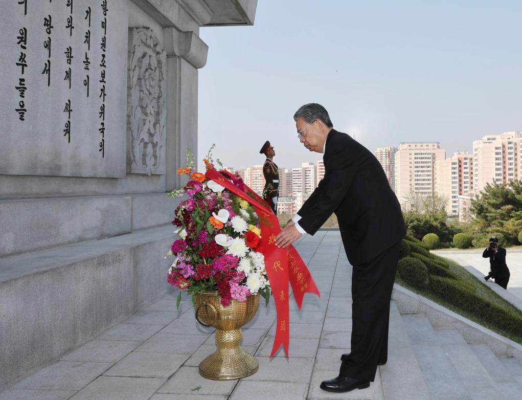 Zhao Leji, a member of the Standing Committee of the Political Bureau of the Communist Party of China (CPC) Central Committee and chairman of China's National People's Congress Standing Committee, presents a floral basket to the China-DPRK Friendship Tower in Pyongyang, the Democratic People's Republic of Korea (DPRK), April 12, 2024. Zhao Leji and Choe Ryong Hae, a member of the Presidium of the Political Bureau of the Central Committee of the Workers' Party of Korea (WPK) and chairman of the Standing Committee of the Supreme People's Assembly of the DPRK, held talks and attended the opening ceremony of the "China-DPRK Friendship Year" from April 11 to 12. (Xinhua/Liu Weibing)
