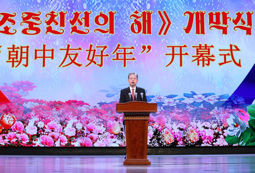 Zhao Leji, a member of the Standing Committee of the Political Bureau of the Communist Party of China (CPC) Central Committee and chairman of China's National People's Congress Standing Committee, addresses the opening ceremony of the "China-DPRK Friendship Year" at the East Pyongyang Grand Theater in Pyongyang, the Democratic People's Republic of Korea (DPRK), April 12, 2024. Zhao Leji and Choe Ryong Hae, a member of the Presidium of the Political Bureau of the Central Committee of the Workers' Party of Korea (WPK) and chairman of the Standing Committee of the Supreme People's Assembly of the DPRK, held talks and attended the opening ceremony of the "China-DPRK Friendship Year" from April 11 to 12. (Xinhua/Liu Weibing)
