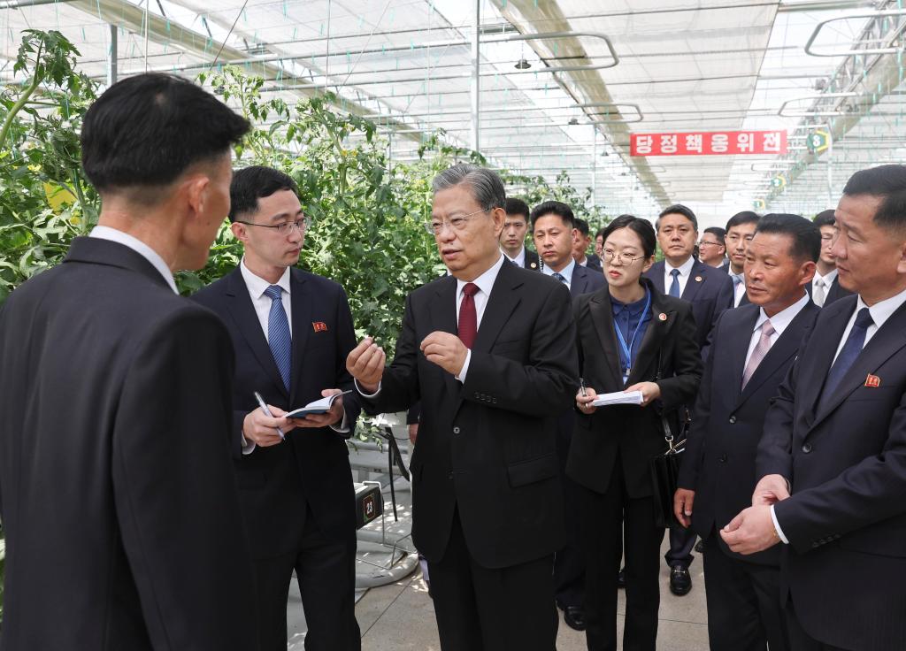 Zhao Leji, a member of the Standing Committee of the Political Bureau of the Communist Party of China (CPC) Central Committee and chairman of China's National People's Congress Standing Committee, visits the Kangdong General Greenhouse Farm in Pyongyang, the Democratic People's Republic of Korea (DPRK), April 12, 2024. Zhao Leji and Choe Ryong Hae, a member of the Presidium of the Political Bureau of the Central Committee of the Workers' Party of Korea (WPK) and chairman of the Standing Committee of the Supreme People's Assembly of the DPRK, held talks and attended the opening ceremony of the "China-DPRK Friendship Year" from April 11 to 12. (Xinhua/Liu Weibing)