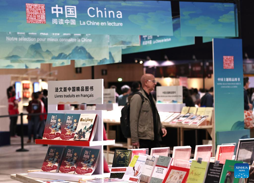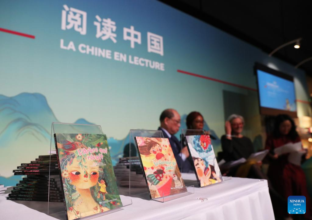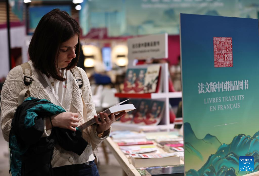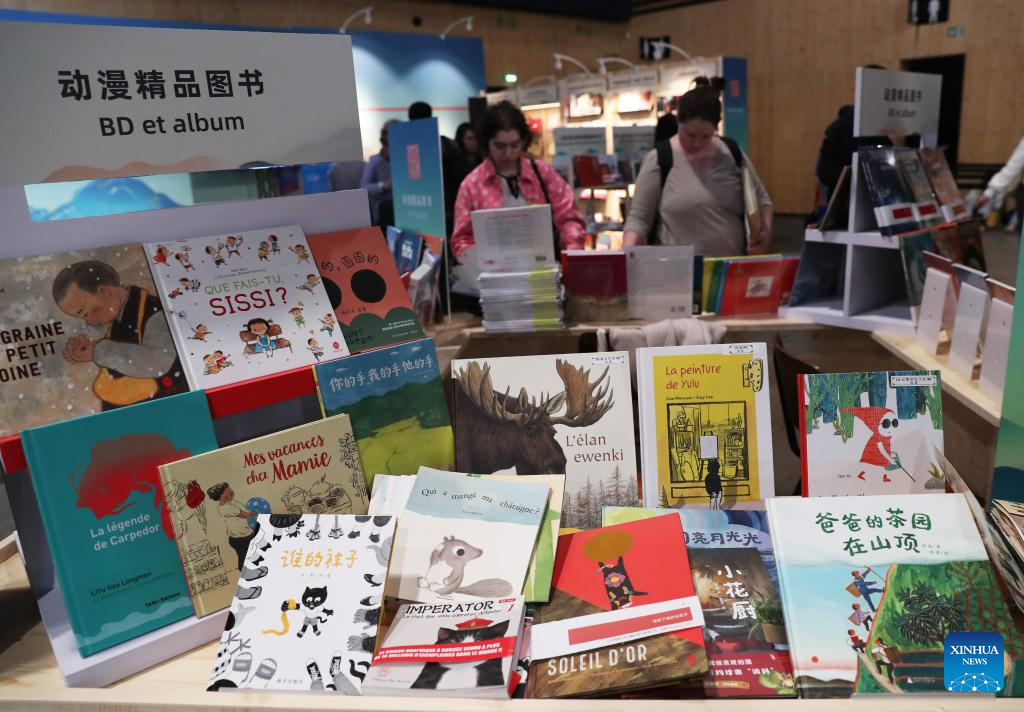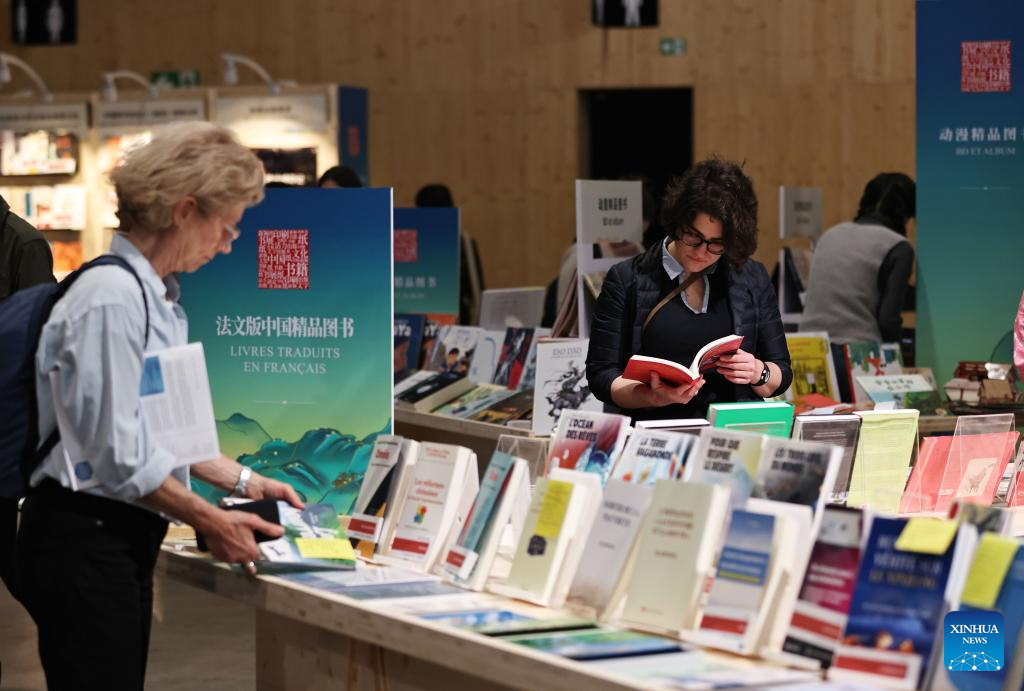 Chinese books are pictured during Paris Book Festival 2024 in Paris, France, April 12, 2024. The book festival opened Friday and will last for three days here. About 1,150 Chinese books are on display and on sale at the event, of which more than 40 percent are in French version. (Xinhua/Gao Jing)