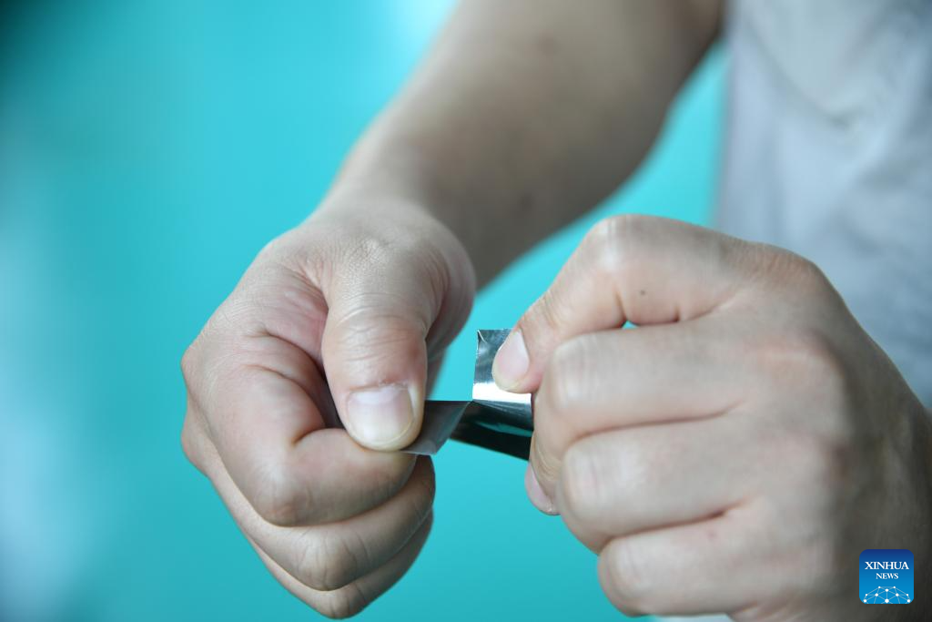 A technician picks up newly-processed 0.015mm ultra-thin high temperature alloy steel strip at a lab under Pangang Group Research Institute Co., Ltd. in Panzhihua City, southwest China's Sichuan Province, April 10, 2024. (Xinhua/Zhang Haofu)