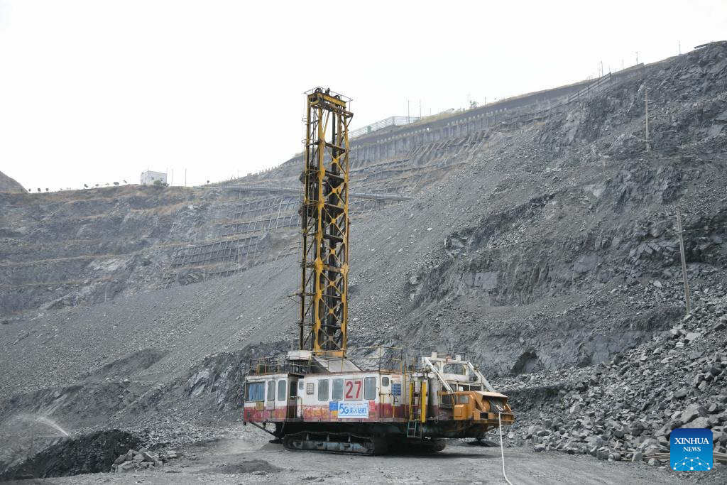 This photo taken on April 11, 2024 shows a 5G-powered unmanned drilling machine at an iron ore mine branch of Pangang Group in Panzhihua City, southwest China's Sichuan Province. (Xinhua/Xu Bingjie)
