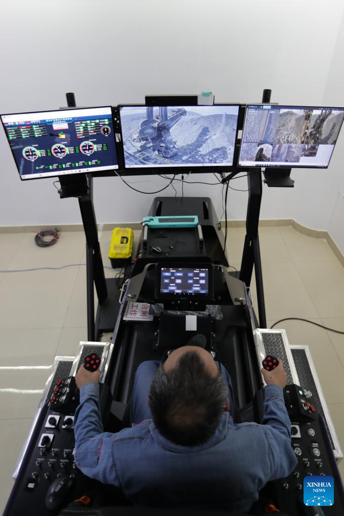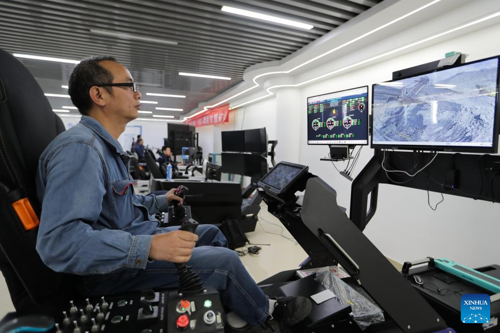 A technician controls electric shovel remotely at a smart control center of an iron ore mine branch of Pangang Group in Panzhihua City, southwest China's Sichuan Province, April 11, 2024. (Xinhua/Guo Yu)