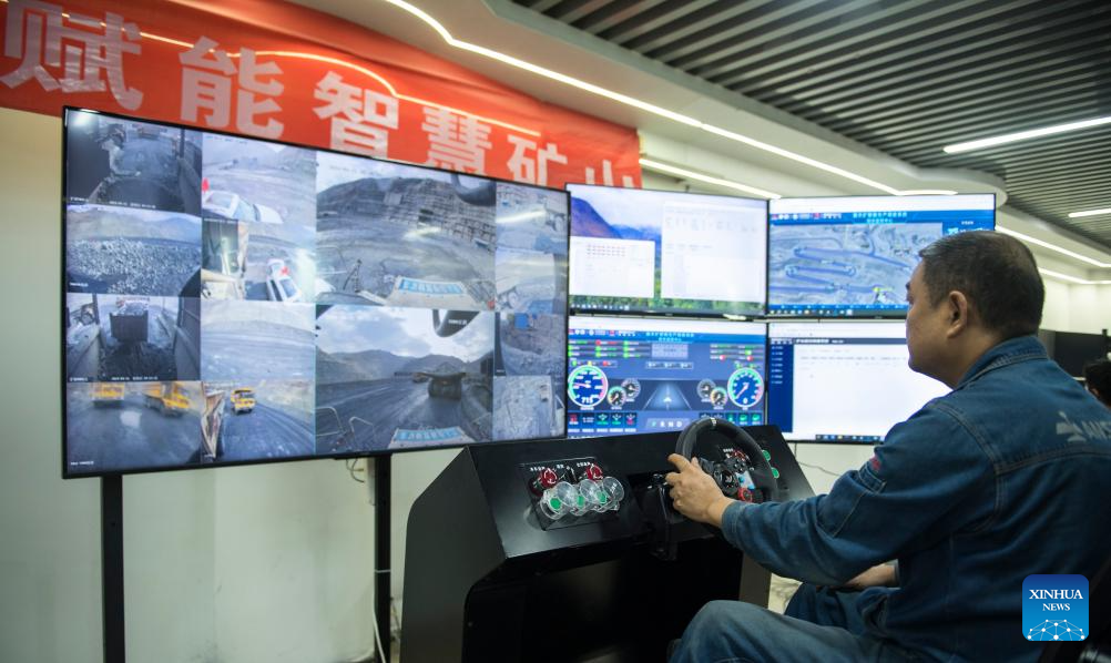 A technician controls an unmanned truck at a smart control center of an iron ore mine branch of Pangang Group in Panzhihua City, southwest China's Sichuan Province, April 11, 2024. (Xinhua/Zhang Haofu)