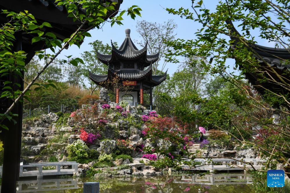 This photo taken on April 12, 2024 shows the Nanjing Garden of the International Horticultural Exhibition 2024 Chengdu in Chengdu, southwest China's Sichuan Province. The expo will run from April 26 to Oct. 28, during which time more than 2,000 events and cultural activities will be held. (Xinhua/Wang Xi)