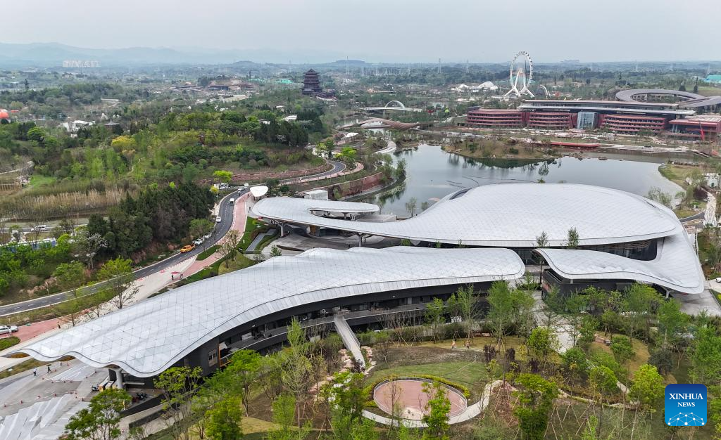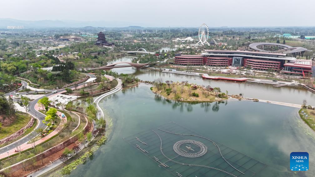 An aerial drone photo taken on April 12, 2024 shows a view of the main venue of the International Horticultural Exhibition 2024 Chengdu in Chengdu, southwest China's Sichuan Province. The expo will run from April 26 to Oct. 28, during which time more than 2,000 events and cultural activities will be held. (Xinhua/Wang Xi)