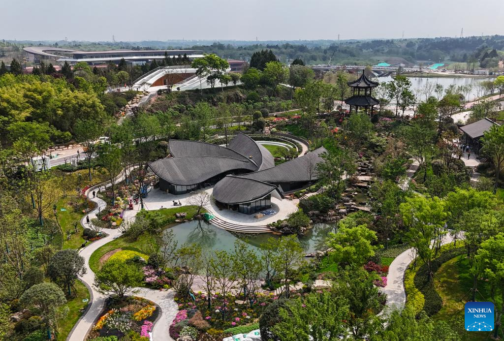 An aerial drone photo taken on April 12, 2024 shows the Beijing Garden of the International Horticultural Exhibition 2024 Chengdu in Chengdu, southwest China's Sichuan Province. The expo will run from April 26 to Oct. 28, during which time more than 2,000 events and cultural activities will be held. (Xinhua/Wang Xi)