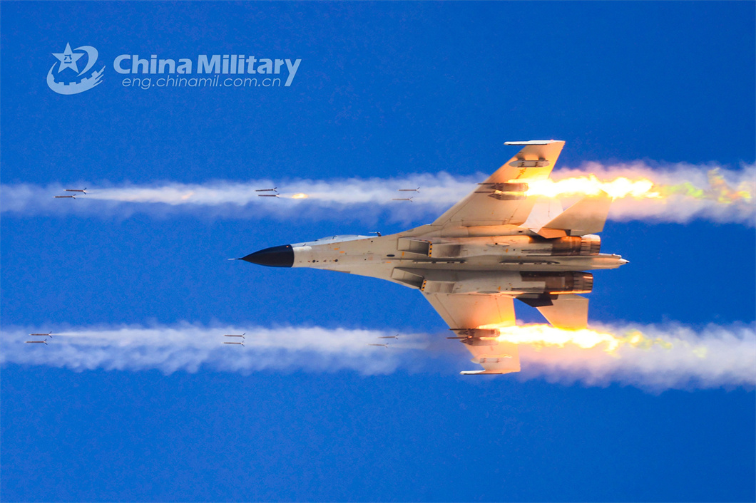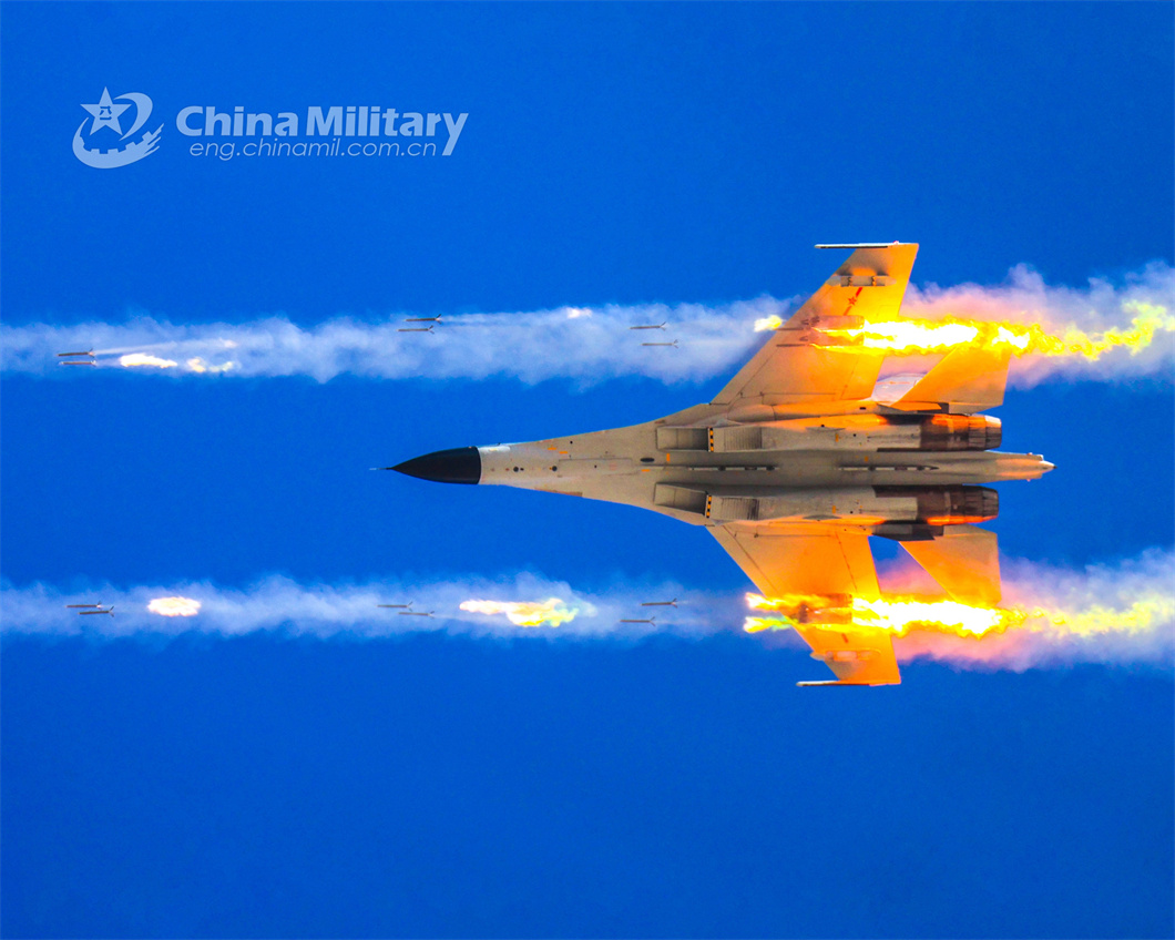 A fighter jet attached to a brigade under the PLA Air Force Xi'an Flying College fires rockets at mock ground targets during a live-fire flight training exercise on March 22, 2024. (eng.chinamil.com.cn/Photo by Cui Baoliang)