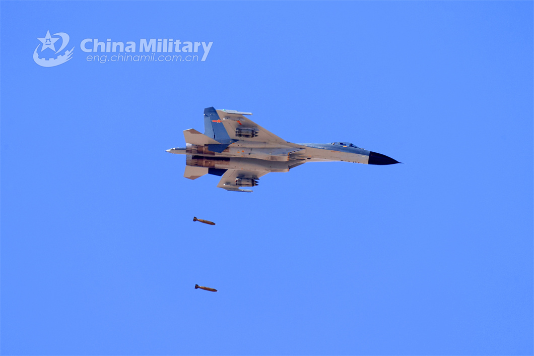 A fighter jet attached to a brigade under the PLA Air Force Xi'an Flying College releases bombs at a designated ground target during a live-fire flight training exercise on March 22, 2024. (eng.chinamil.com.cn/Photo by Cui Baoliang)