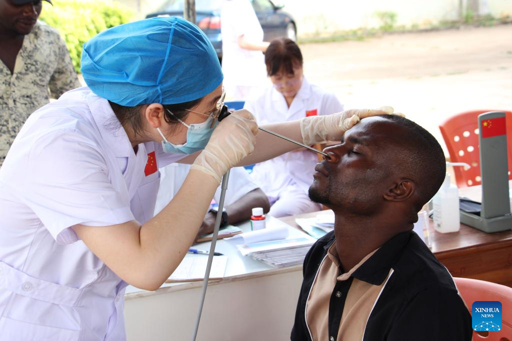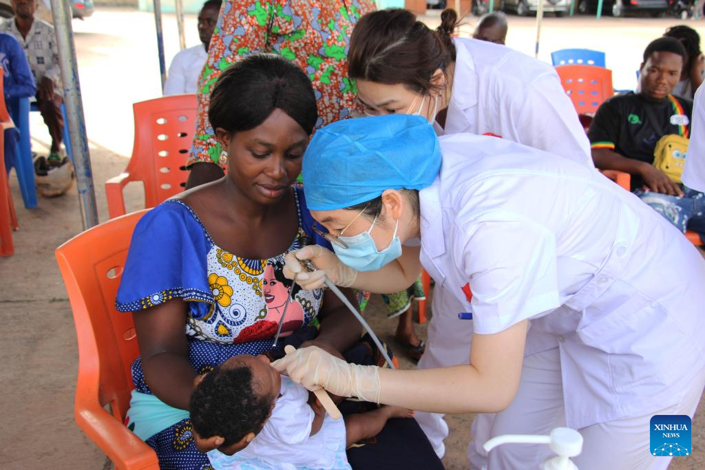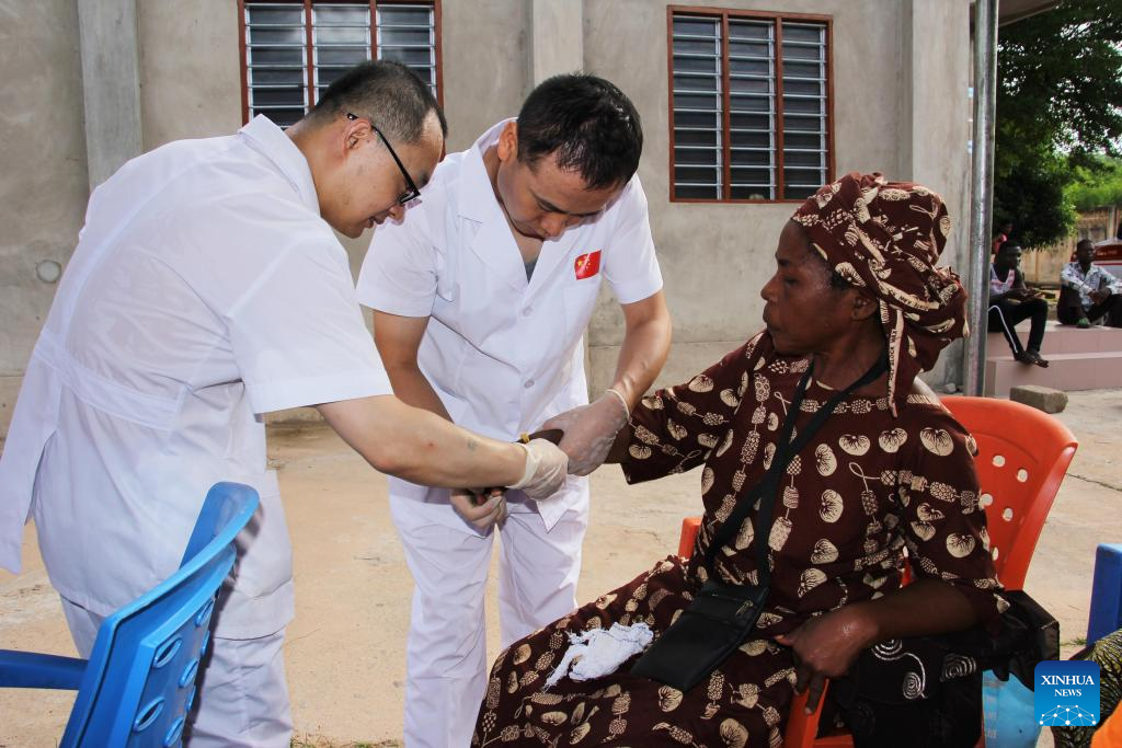 Doctors of the 27th Chinese medical team provide free medical service for a patient at the Mono-Couffo Departmental Hospital Center in Lokossa, Benin, April 12, 2024. (Photo by Seraphin Zounyekpe/Xinhua)