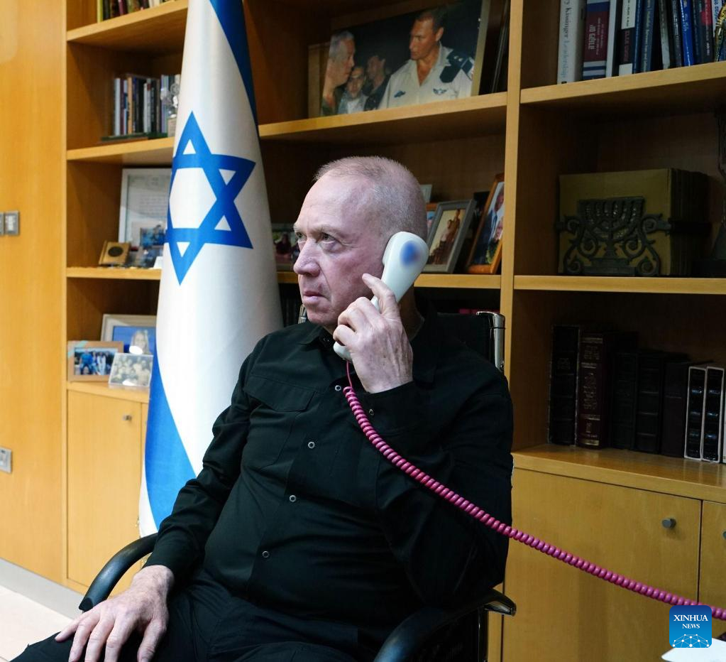 This photo released by Israeli Defense Ministry on April 14, 2024 shows Israeli Defense Minister Yoav Gallant having a phone call with U.S. Defense Secretary Lloyd Austin. On Saturday night, U.S. Defense Secretary Lloyd Austin spoke for the second time with his Israeli counterpart, Yoav Gallant, during which the Pentagon chief reiterated Washington's "ironclad" support for Israel's defense, Pentagon press secretary Pat Ryder said in a statement. (Ariel Hermoni - Israeli Defense Ministry/Handout via Xinhua)