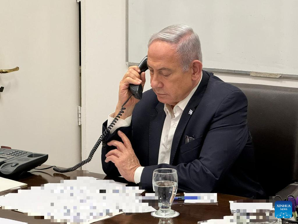 This photo released on April 14, 2024 shows Israeli Prime Minister Benjamin Netanyahu making a phone call with U.S. President Joe Biden. U.S. President Joe Biden told Israeli Prime Minister Benjamin Netanyahu during a call on Saturday that the United States will oppose any Israeli counterattack against Iran, U.S. news portal Axios reported, citing a senior White House official. (GPO/Handout via Xinhua)