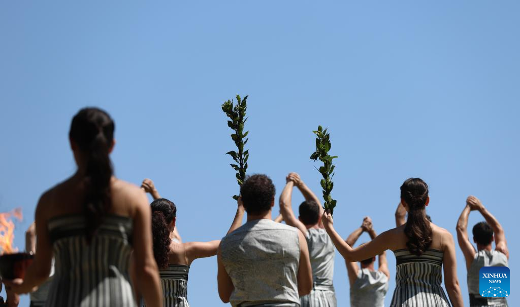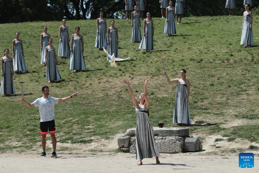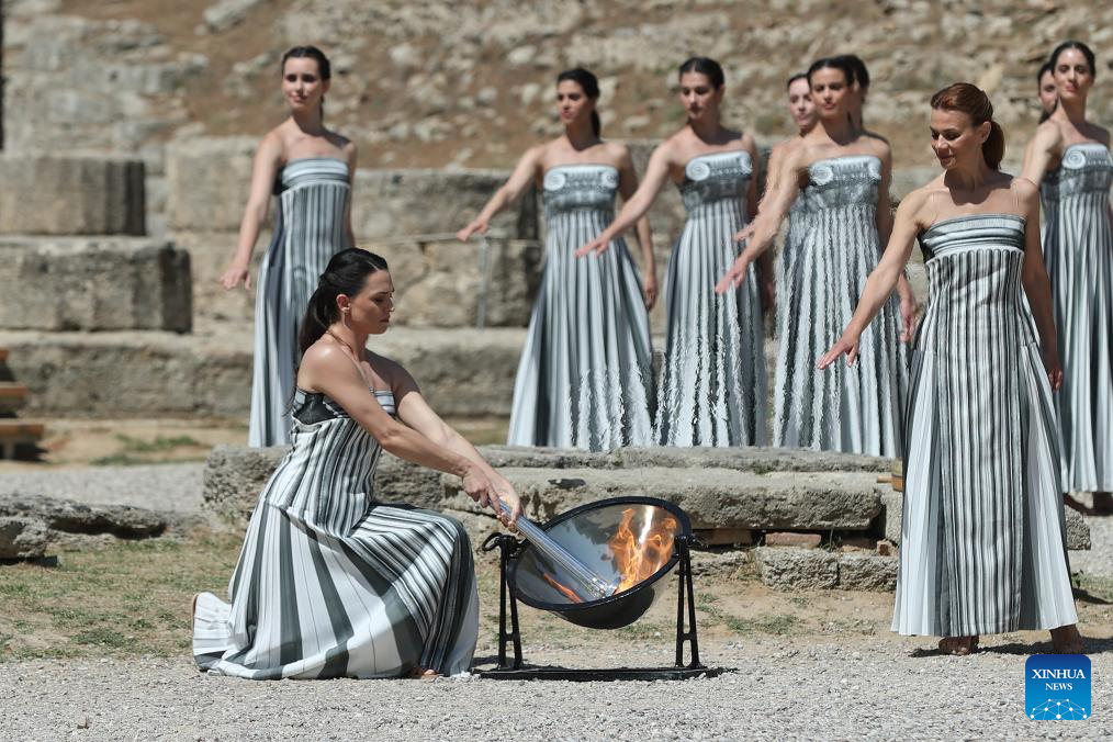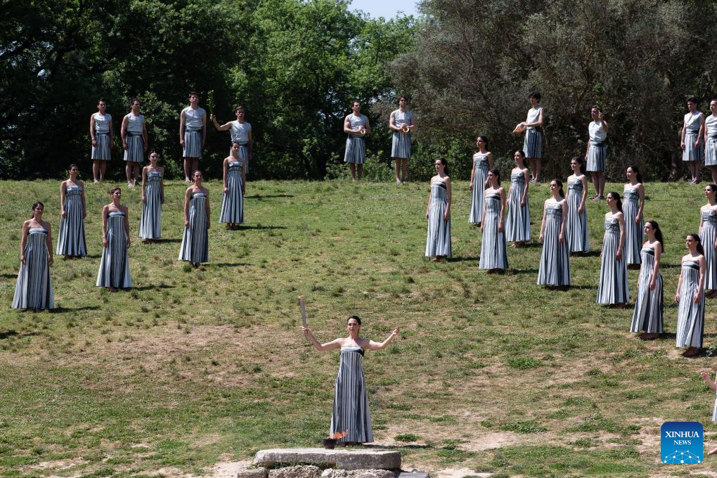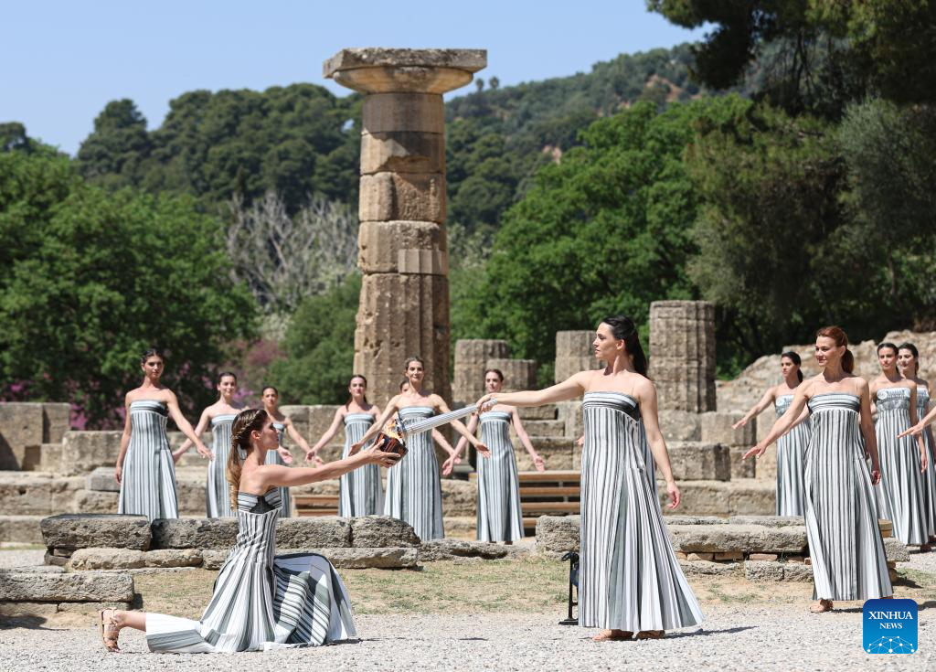 Greek actress Mary Mina (front R), playing the role of the High Priestess, lights the flame during the final dress rehearsal of the Olympic flame lighting ceremony for the Paris 2024 Summer Olympic Games in Ancient Olympia, Greece, on April 15, 2024. (Xinhua/Marios Lolos)