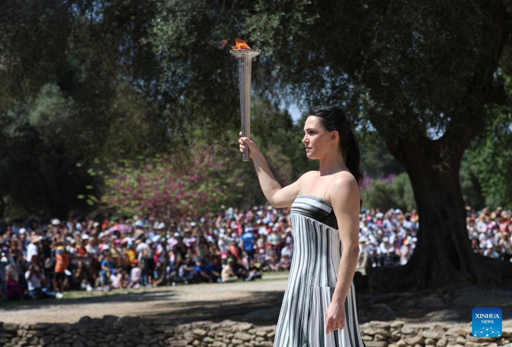 Greek actress Mary Mina (C), playing the role of the High Priestess, holds the flame during the final dress rehearsal of the Olympic flame lighting ceremony for the Paris 2024 Summer Olympic Games in Ancient Olympia, Greece, on April 15, 2024. (Xinhua/Marios Lolos)