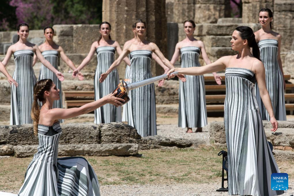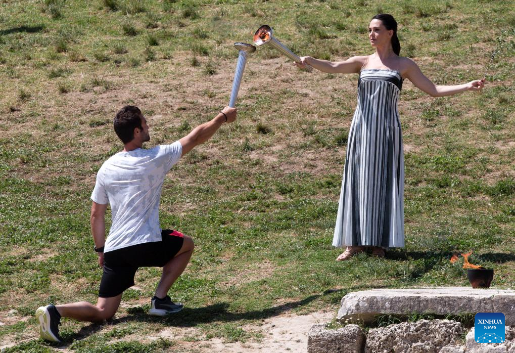 Greek actress Mary Mina (R), playing the role of the High Priestess, passes the flame to the first torch bearer, Greek rowing Olympic champion Stefanos Ntouskos during the final dress rehearsal of the Olympic flame lighting ceremony for the Paris 2024 Summer Olympic Games in Ancient Olympia, Greece, on April 15, 2024. (Xinhua/Marios Lolos)