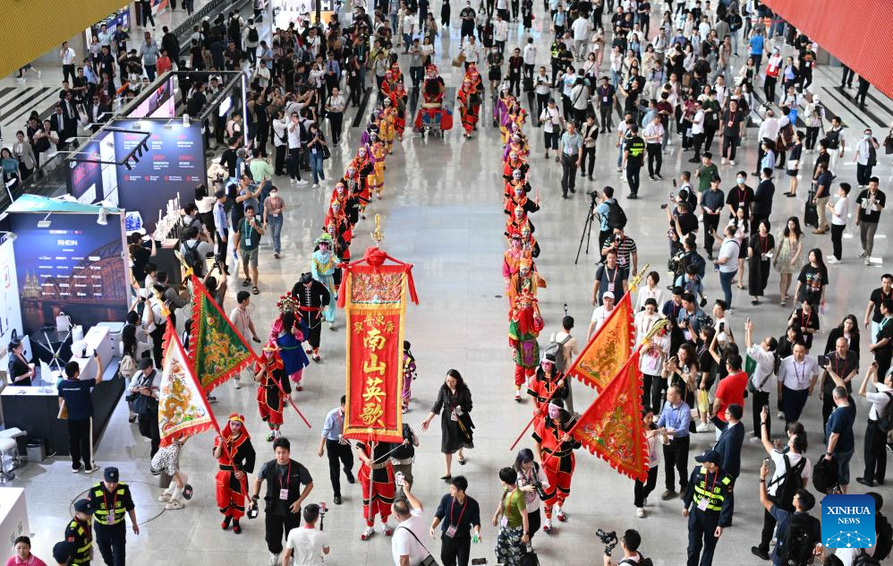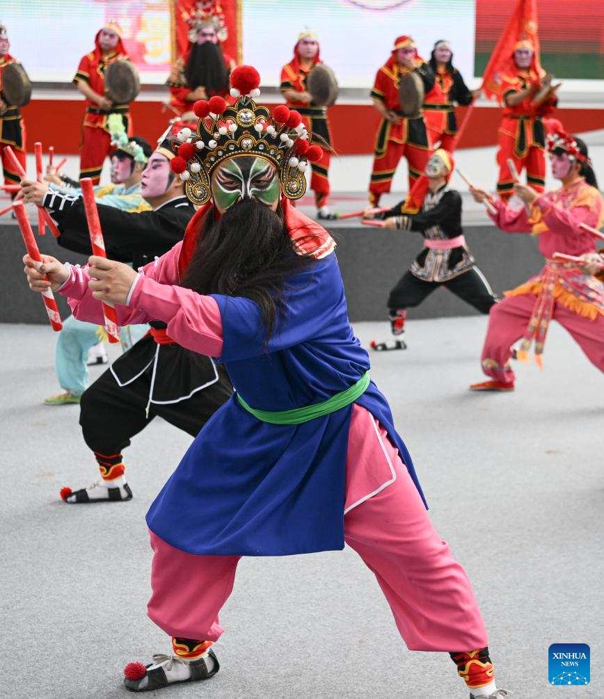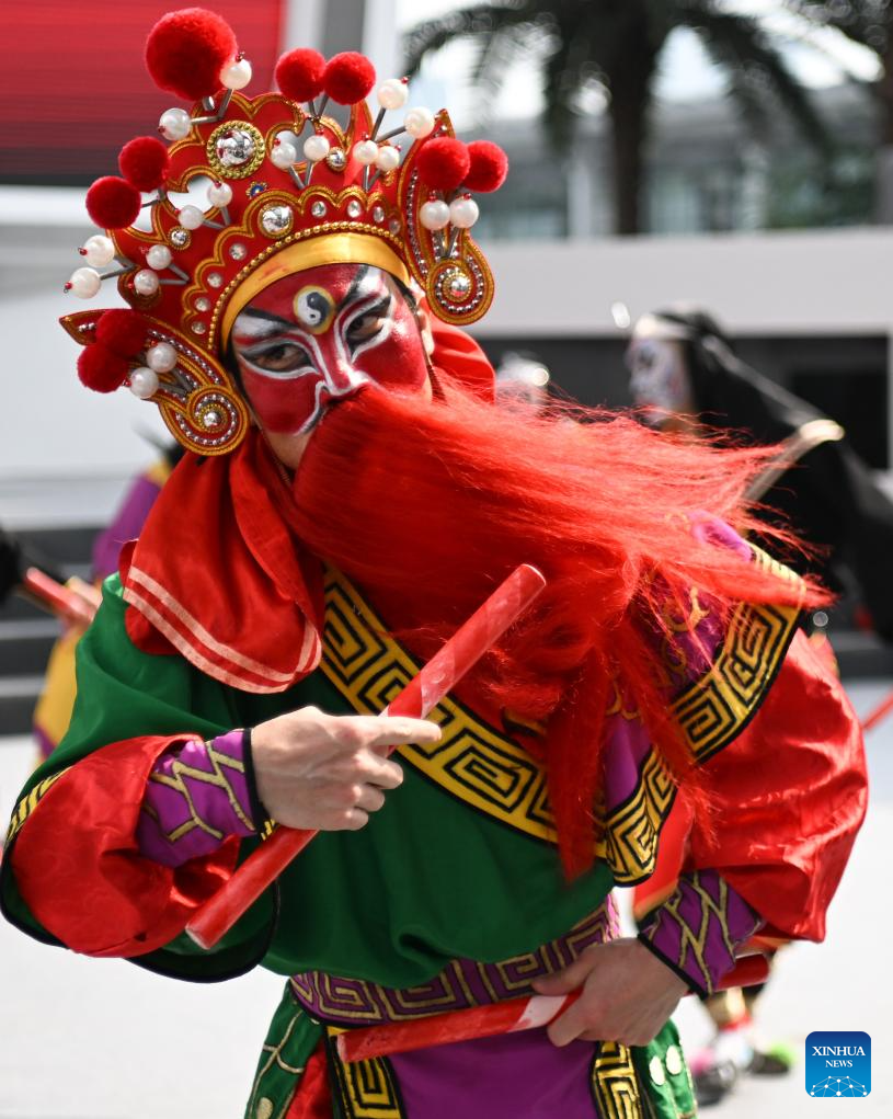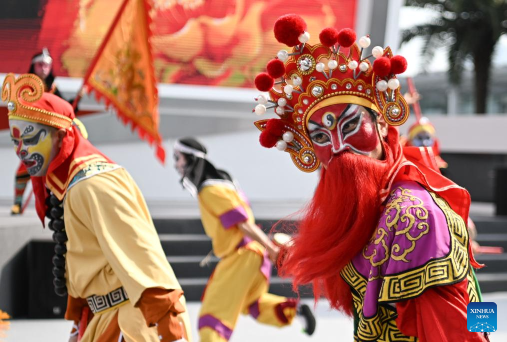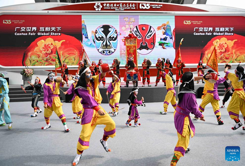 Artists perform Yingge Dance, a form of folk dance popular in south China's Guangdong Province, during the 135th session of the China Import and Export Fair, also known as the Canton Fair, in Guangzhou, south China's Guangdong Province, April. 15, 2024. (Xinhua/Deng Hua)