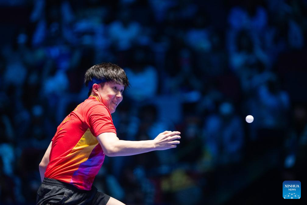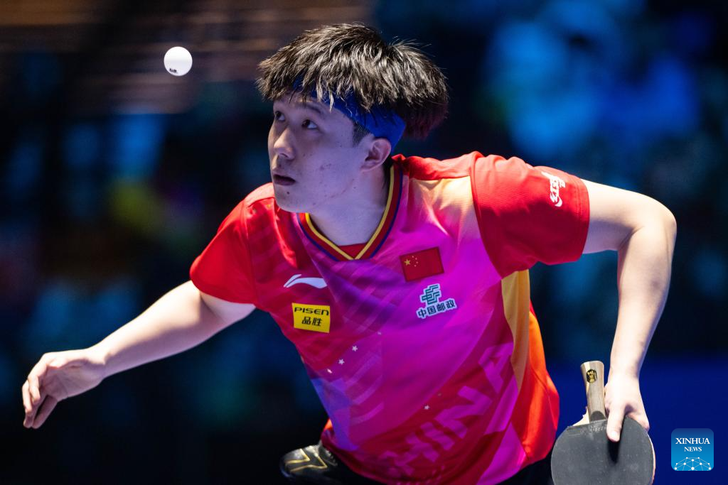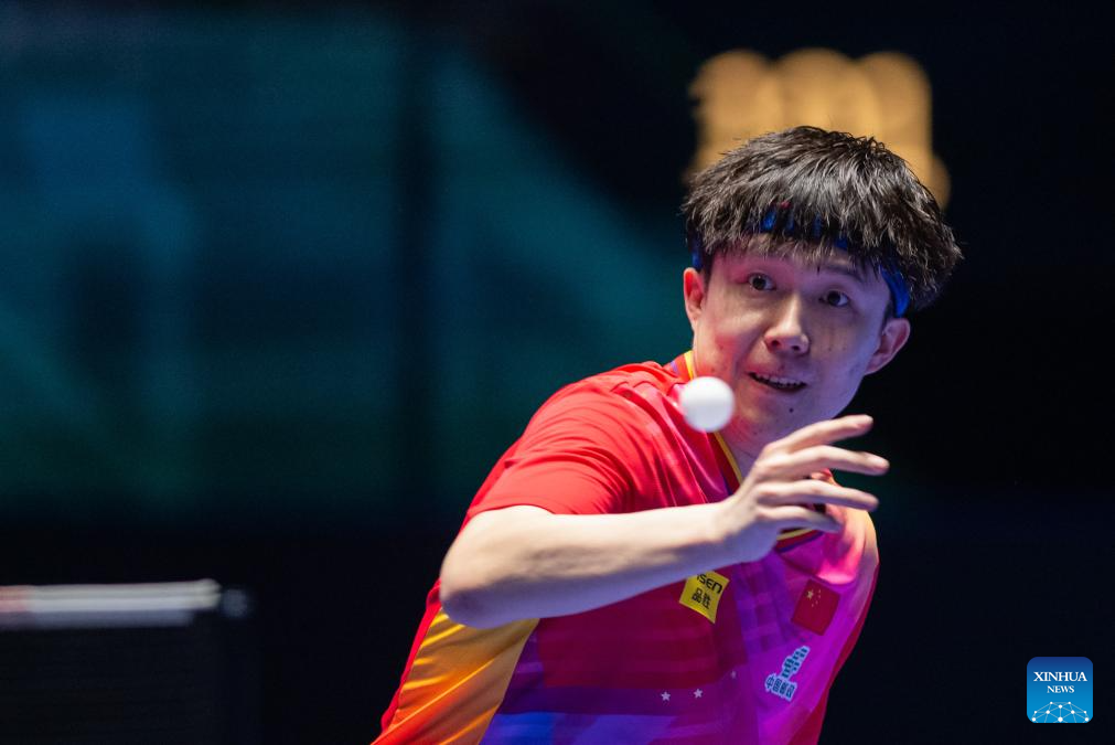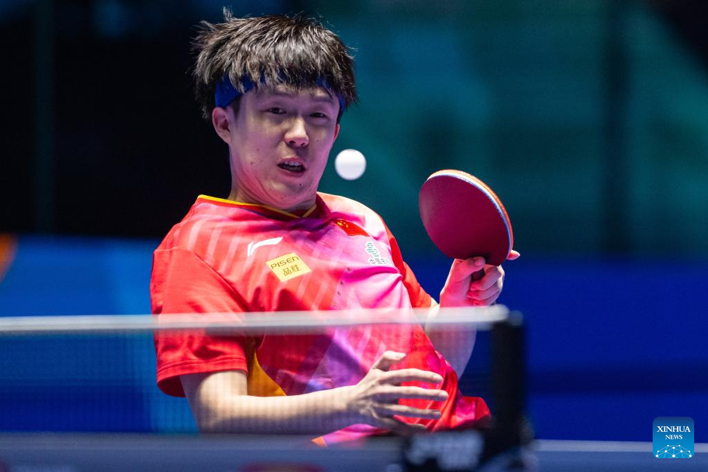 Wang Chuqin of China hits a return during the men's singles match against An Jaehyun of South Korea at the WTT Champions Macao 2024 at Galaxy Macao in Macao, China, April 15, 2024. (Xinhua/Cheong Kam Ka)