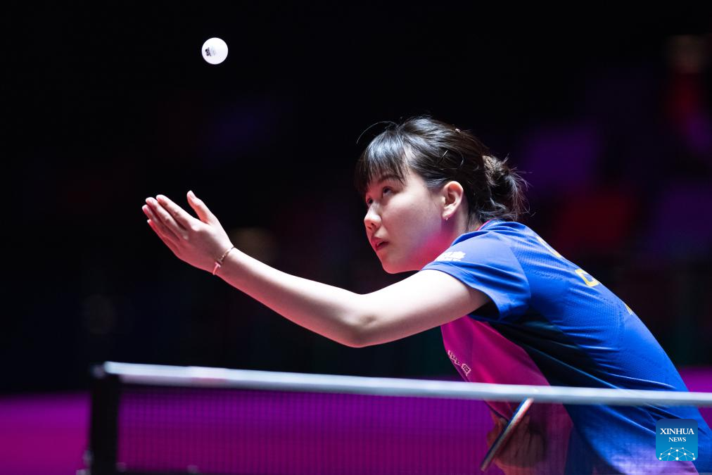 Chen Xingtong of China serves during the women's singles match against Liu Hsing-Yin of Chinese Taipei at the WTT Champions Macao 2024 at Galaxy Macao in Macao, China, April 15, 2024. (Xinhua/Cheong Kam Ka)