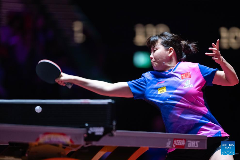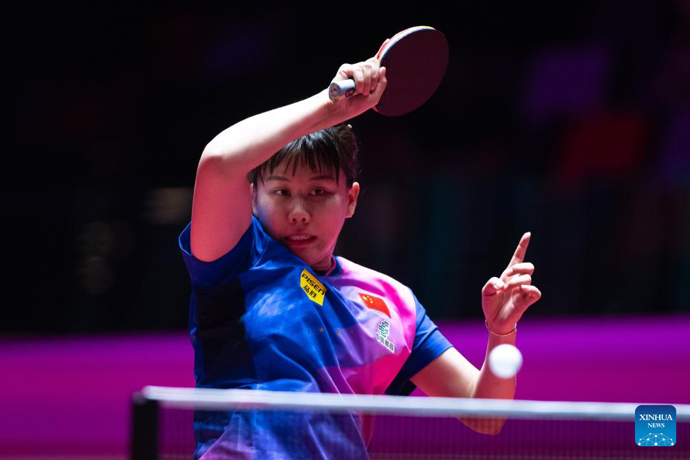 Chen Xingtong of China hits a return during the women's singles match against Liu Hsing-Yin of Chinese Taipei at the WTT Champions Macao 2024 at Galaxy Macao in Macao, China, April 15, 2024. (Xinhua/Cheong Kam Ka)